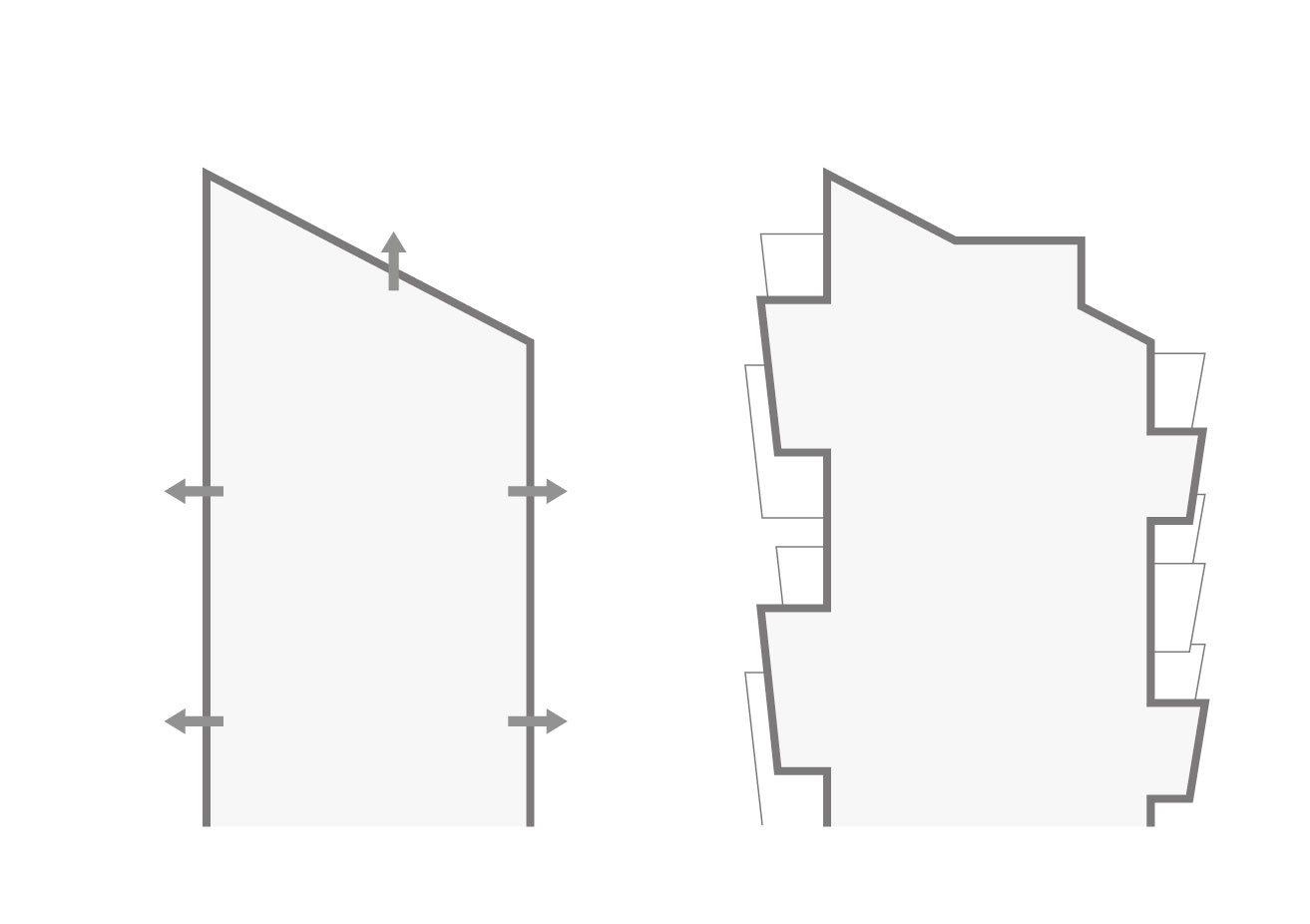 In order to gain more usable room, while also maintaining the slender appearance of the building extrusions are made in varying places. These cantilever arms increase the floor size but don‘t change the main look of the volume.