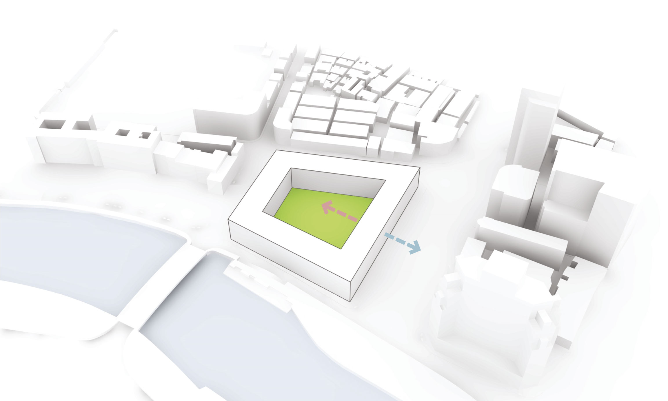 provides visual access to skyline of Pudong (financial area); enables wind circulation for the main wind direction in june and july