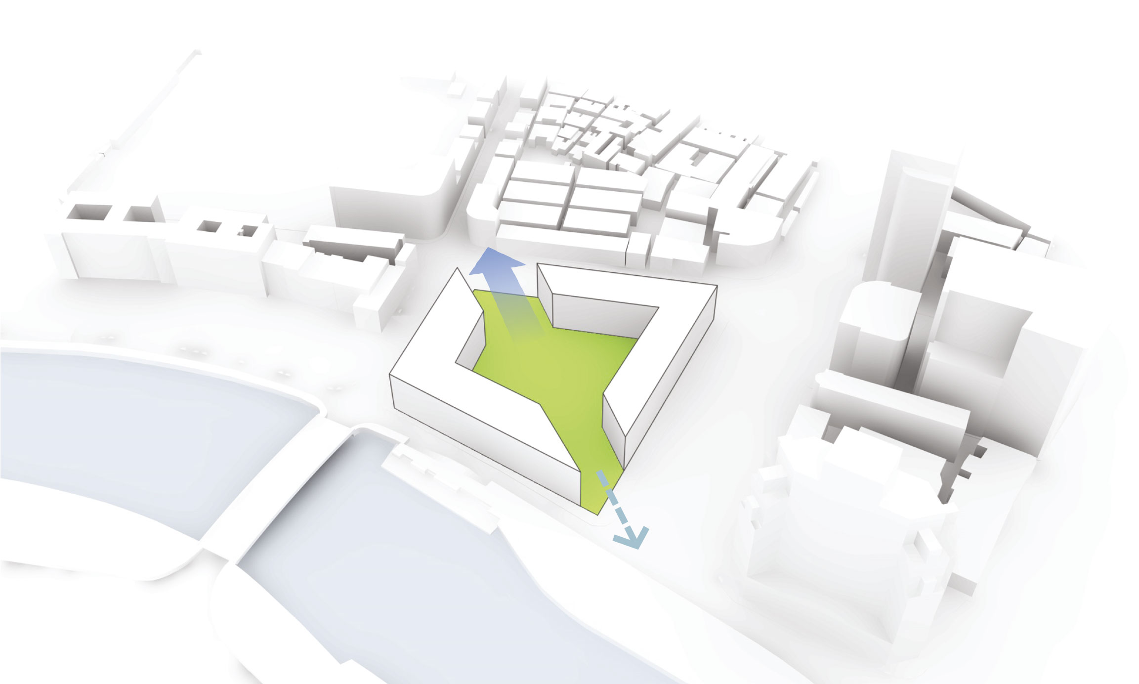 One very important aspect of the design is the way it focuses the attention of the pedestrian. When looking from the Suzhou Creek it gradually gets lower in direction to the Broadway Mansion. As one of the landmarks of Shanghai, it is important not to overshadow it by placing too big a volume next to it. This is why the Suzhou Riverside Terraces decidedly stay below the height of the Broadway Mansion and